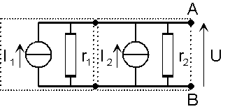 La conductancia[5] del generador equivalente a una asociación en paralelo[6] es igual a la suma de mas conductancias de los generadores asociados; dicho de otra forma, su resistencia[4] interna es igual a la resistencia equivalente a las dos resistencias asociadas en paralelo. En conclusión, del punto de vista activo, las corrientes se adicionan de manera algebraica; del punto de vista pasivo[7] , las conductancias se adicionan.